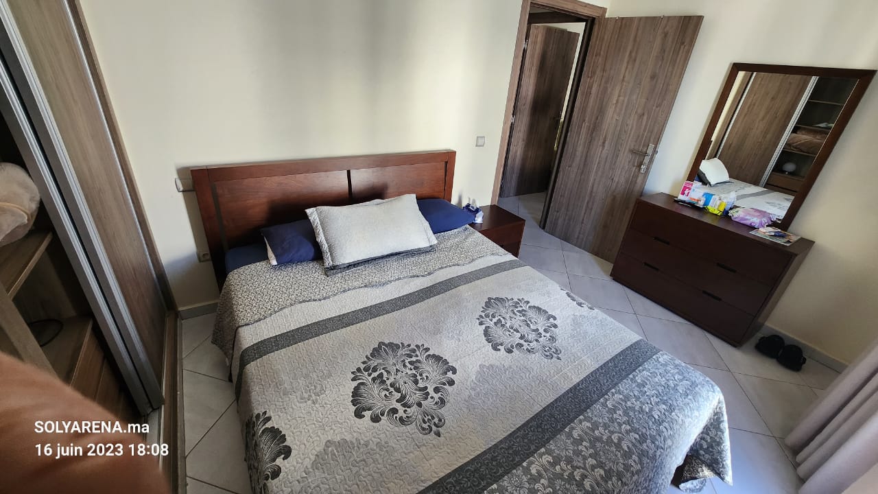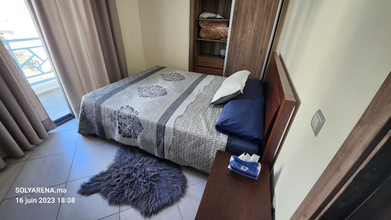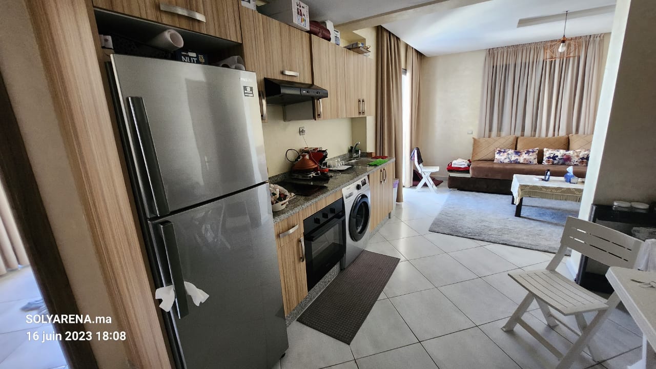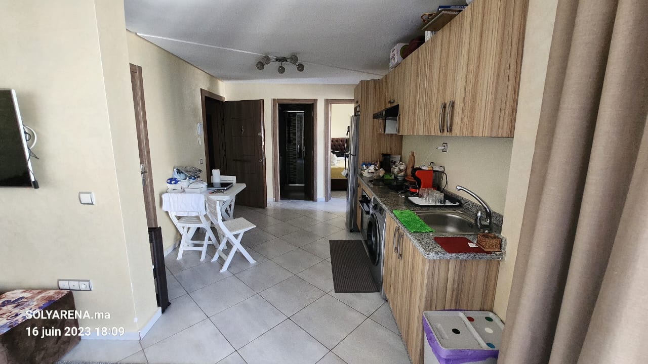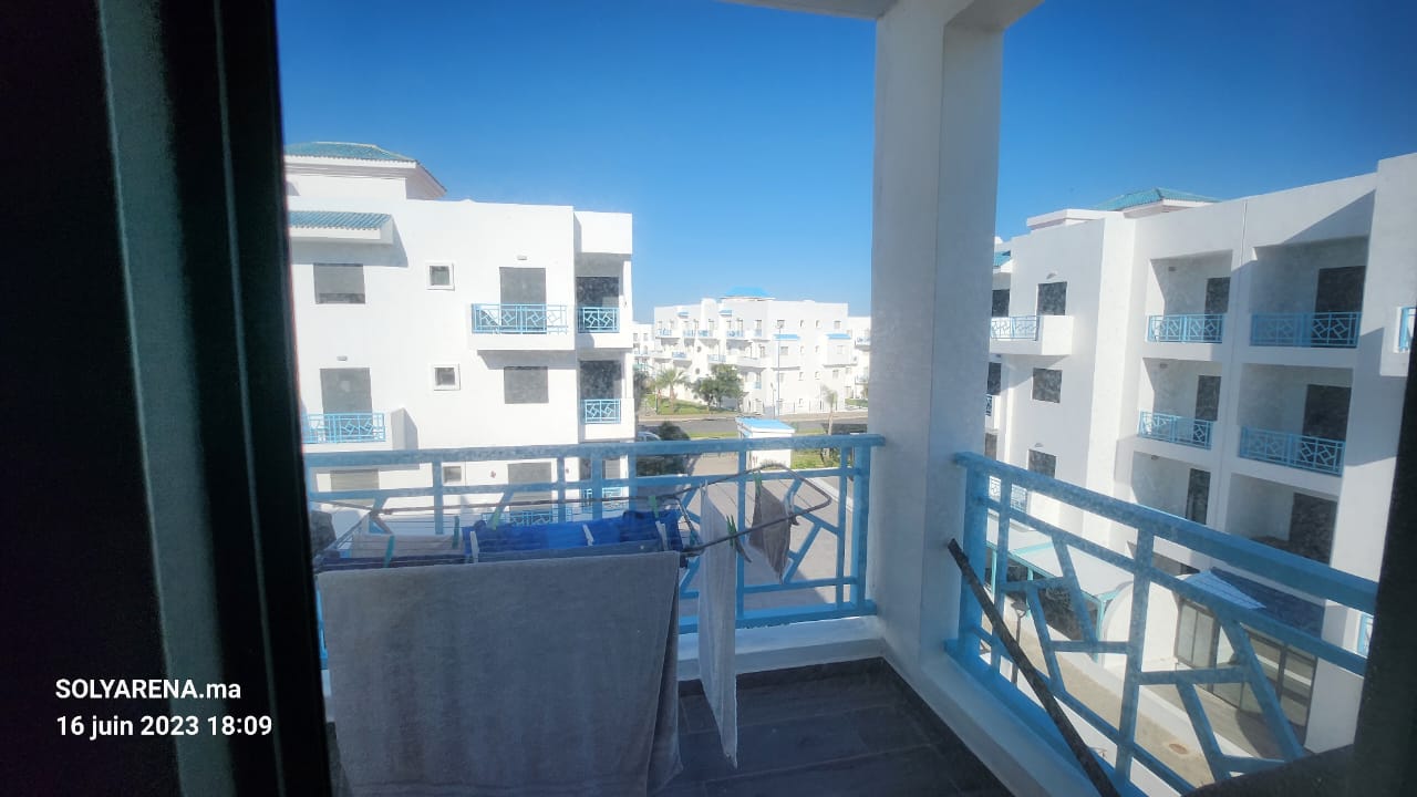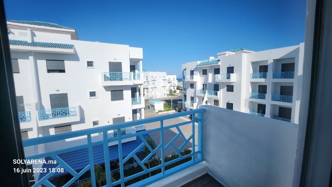 appartement de deux chambres salon un salle de bain cuisine équipée et terrasse situé a 3eme étage dans un résidence fermé calme et sécurisé avec un grand piscine en plus des jardins les espaces jeux pour enfants