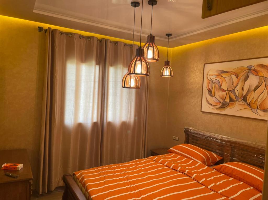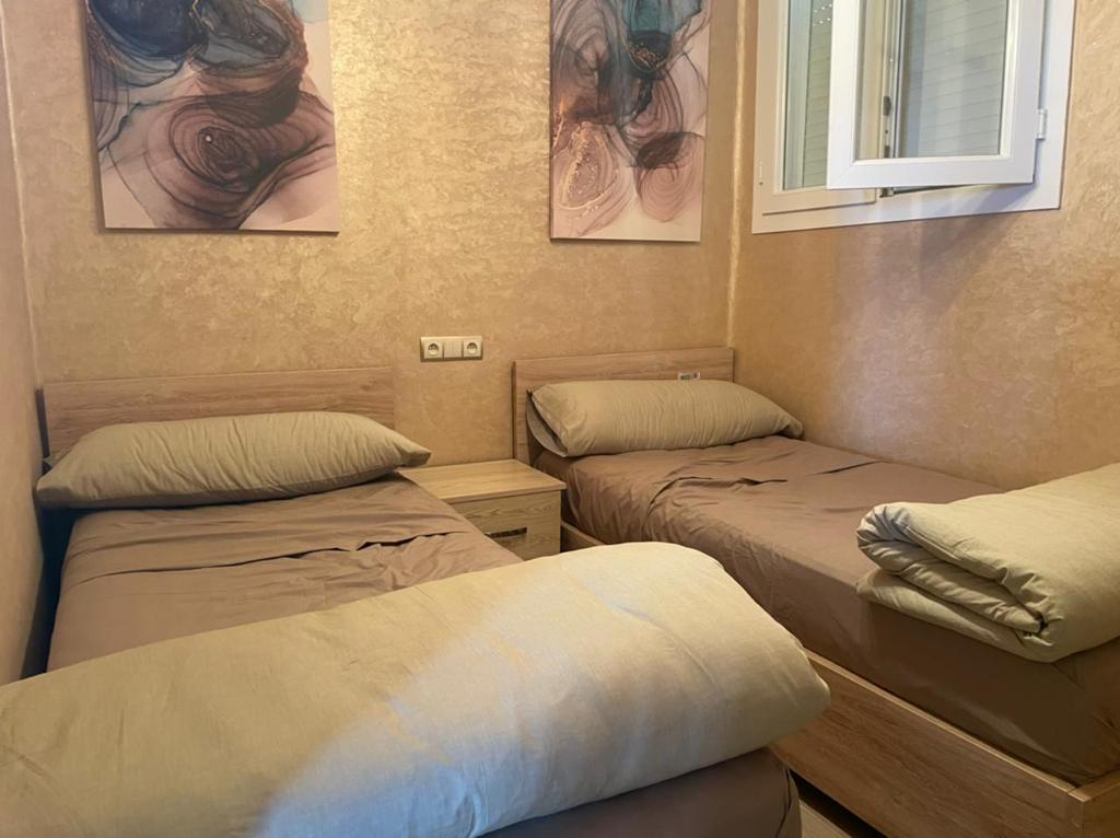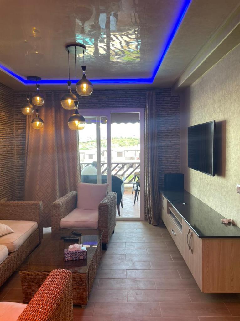 Appartement à 3émé étage situé à résidence mirador golf 1 à station balnéaire touristique cabo negro de deux chambres, un chambre pour les parents de un grand lit de deux places un placard , un chambre pour les enfants de deux lits simple avec un placard, un salle de bain équipée de sanitaire céramique , salon moderne de trois canapés , tv , salle à manger table et 4 chaises.