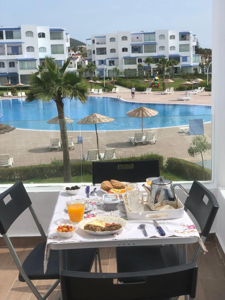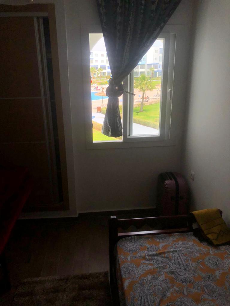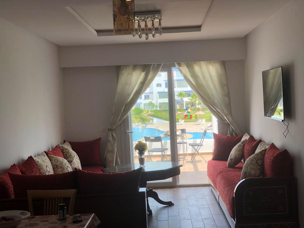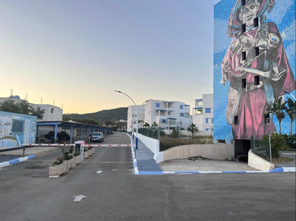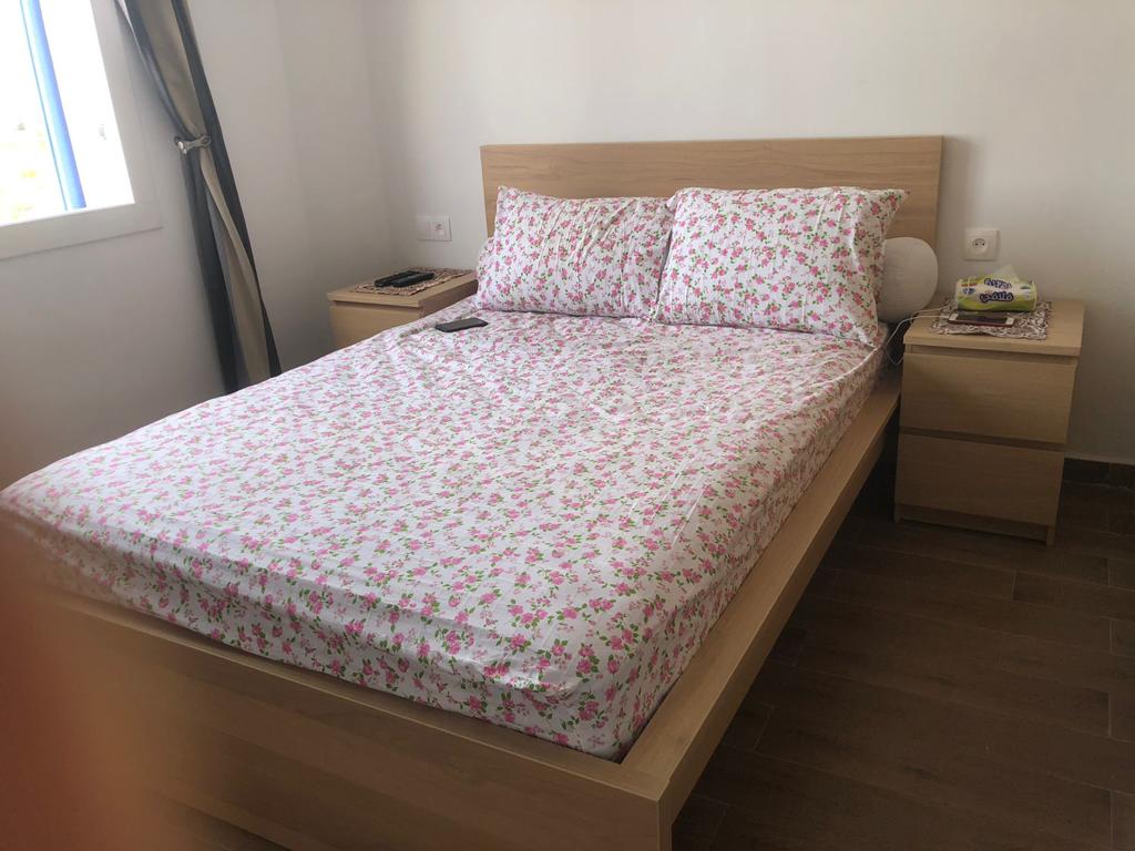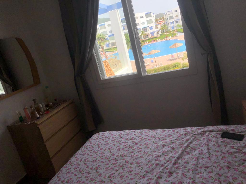 Appartement situé à résidence mirador golf 2 à Station balnéaire touristique cabo negro il se compose de deux chambres un chambre parentale avec un grand lits pour deux personnes , un placard , et un chambre pour les enfants équipée de deux lits simple, un placard , un salle de bain équipée de sanitaire céramique , un salon moderne de trois canapé très confortable , tv , un sala manger de table et4 chaises , cuisine American équipée du équipements nécessaire comme :